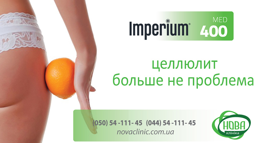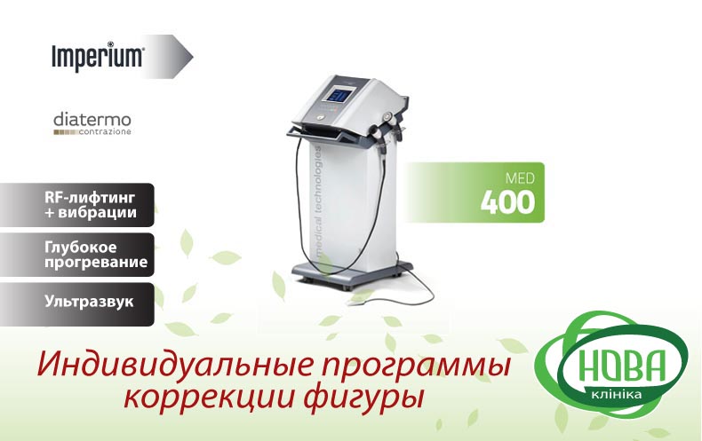 У Клініці Нова використовується багатофункціональний комбайн для естетичної медицини Imperium 400 (Італія) з широким набором аплікаторів. Апарат працює в режимі діатермії (RF ліфтинг), ультразвукового випромінювання високих і низьких частот, механічних вібрацій.