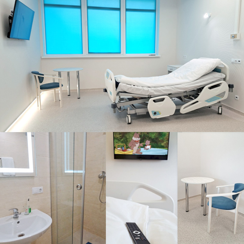 - Комфортні умови перебування. Палати стаціонару одномісні, є палати підвищеного комфорту з можливістю перебування супровідника. Всі палати забезпечують максимально комфортні умови для лікування та відновлення.